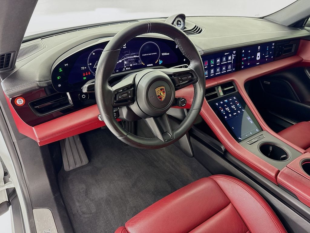 2021 Porsche Taycan 4S in Carrara White Metallic with Leather Interior in Black/Bordeaux Red. Under Porsche Approved Certified Pre-Owned Warranty for 2 Years and Unlimited Miles from Date of Purchase. Premium Package: Ionizer, Power Seats (14-way) with Memory Package, Massage Seat Function incl Ventilated Seats (front), Storage Package, BOSE Surround Sound, LED-Matrix Design Headlights incl PDLS+, Fixed Panoramic Roof in Glass, Lane Change Assist, and Surround View. Also Features: Power Folding Exterior Mirrors, Window Trim in High Gloss Black, Under Door Puddle Light Projectors, "Taycan 4S" Logo on Rear in High Gloss Black, Porsche Electric Sport Sound, Performance Battery Plus, Sport Chrono Package, Porsche Surface Coated Brakes with Calipers in White, Wheels Painted in Exterior Color, 21" Mission E Design Wheels, Advanced 4-Zone Climate Control, Rear 2+1 Seats, Heated GT Sport Steering Wheel, Sport Chrono Stopwatch Dial in White, Passenger Display, Power Charge Port Cover, On-Board 150 kW/400V DC Charger, Porsche Intelligent Range Manager, Mobile Charger Connect, and Adaptive Cruise Control. Available at Porsche Grapevine 1280 Texan Trail Grapevine TX 76051.