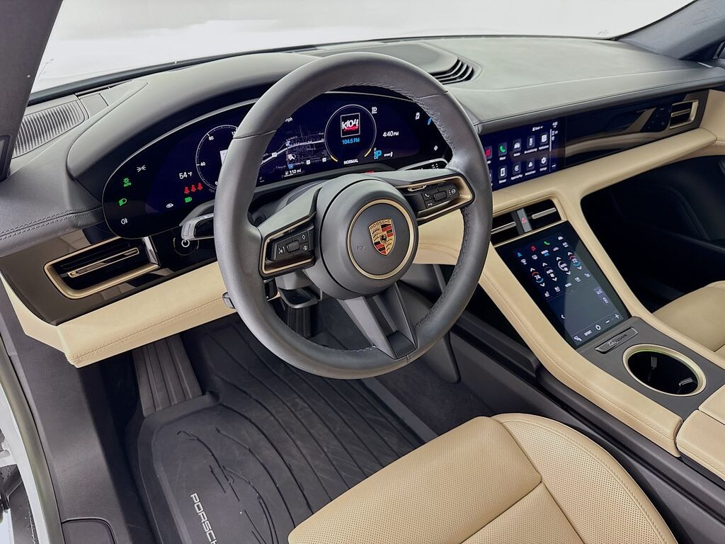 2023 Porsche Taycan in Carrara White Metallic with Olea Club Leather Interior in Basalt Black and Atacama Beige. Under Porsche Approved Certified Pre-Owned Warranty for 2 Years and Unlimited Miles from Expiration of Porsche New Vehicle Warranty. New Vehicle Warranty Start Date is 3/31/2023. Premium Package: Power Folding Exterior Mirrors, Ionizer, Ambient Lighting, Adaptive Sport Seats Plus (18-way) with Comfort Memory, Ventilated Seats (front), Storage Package, PDLS+, Fixed Panoramic Roof in Glass, Surround View, and Lane Change Assist. Also Features: Model Designation on Rear in High Gloss Black, Porsche Surface Coated Brakes with Calipers in White, 21" Mission E Design Wheels, Rear 2+1 Seats, Performance Battery Plus, Thermally and Noise Insulated Glass, and Head-Up Display. Available at Porsche Grapevine 1280 Texan Trail Grapevine TX 76051.