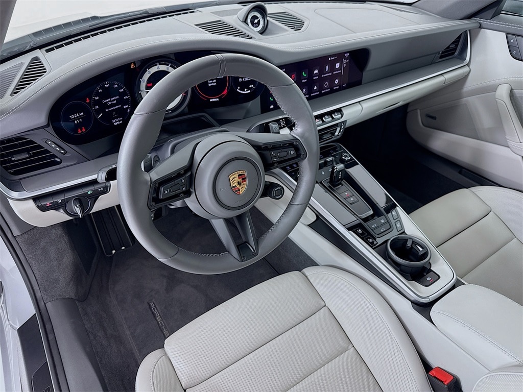 2024 Porsche 911 Carrera GTS in Ice Grey Metallic with Leather Interior in Slate Grey/Chalk. Under Porsche Approved Certified Pre-Owned Warranty for up to 3 Years and Unlimited Miles from Expiration of Porsche New Vehicle Warranty. New Vehicle Warranty Start Date is 6/13/2024. Premium Package: Storage Package, BOSE Surround Sound, Power Folding Exterior Mirrors, Lane Change Assist, Surround View, and Ambient Lighting. Also with: Electric Slide/Tilt Sunroof in Glass, SportDesign Side Skirts, Front Axle Lift, Power Steering Plus, Extended Range Fuel Tank, 20"/21" RS Spyder Design Wheels in Satin Black, Adaptive Sport Seats Plus (18-way) with Memory Package, GT Sport Steering Wheel in Leather, Central Tachometer in White, Ventilated Seats (front), Seat Belts in Chalk, Interior Trim Inlays in Leather, Sport Chrono Stopwatch Dial in White, Prep for Porsche Dashcam, and Smoking Package. Available at Porsche Grapevine 1280 Texan Trail Grapevine TX 76051.