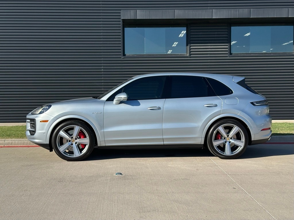 2024 Porsche Cayenne E-Hybrid S EXECUTIVE DEMO in Dolomite Silver with Black Interior. Under Porsche Approved Certified Pre-Owned Warranty for up to 3 Years and Unlimited Miles from Expiration of Porsche New Vehicle Warranty. New Vehicle Warranty Start Date is 6/7/2024. Premium Package Plus: Panoramic Roof, Power Seats (14-way) with Comfort Memory, Heated Seats (rear), Ventilated Seats (front), BOSE Surround Sound, HD-Matrix Design LED Headlights, Surround View with Active Parking Support, Ambient Lighting, 4-Zone Climate Control, and Adaptive Cruise Control. Also with: SportDesign Front Fascia, Exterior Mirror Lower Trim and Base in Exterior Color, Window Trim in High Gloss Black, Sport Chrono Package with Porsche Design Subsecond Clock, Sport Exhaust System incl Tailpipes in Silver, 22" Exclusive Design Sport Wheels, Heated GT Sport Steering Wheel in Leather, Interior Trim in Deep Brushed Aluminum, Exclusive Design Taillights, Soft Close Doors, Smoking Package, and Technology Package. Available at Porsche Grapevine 1280 Texan Trail Grapevine TX 76051.